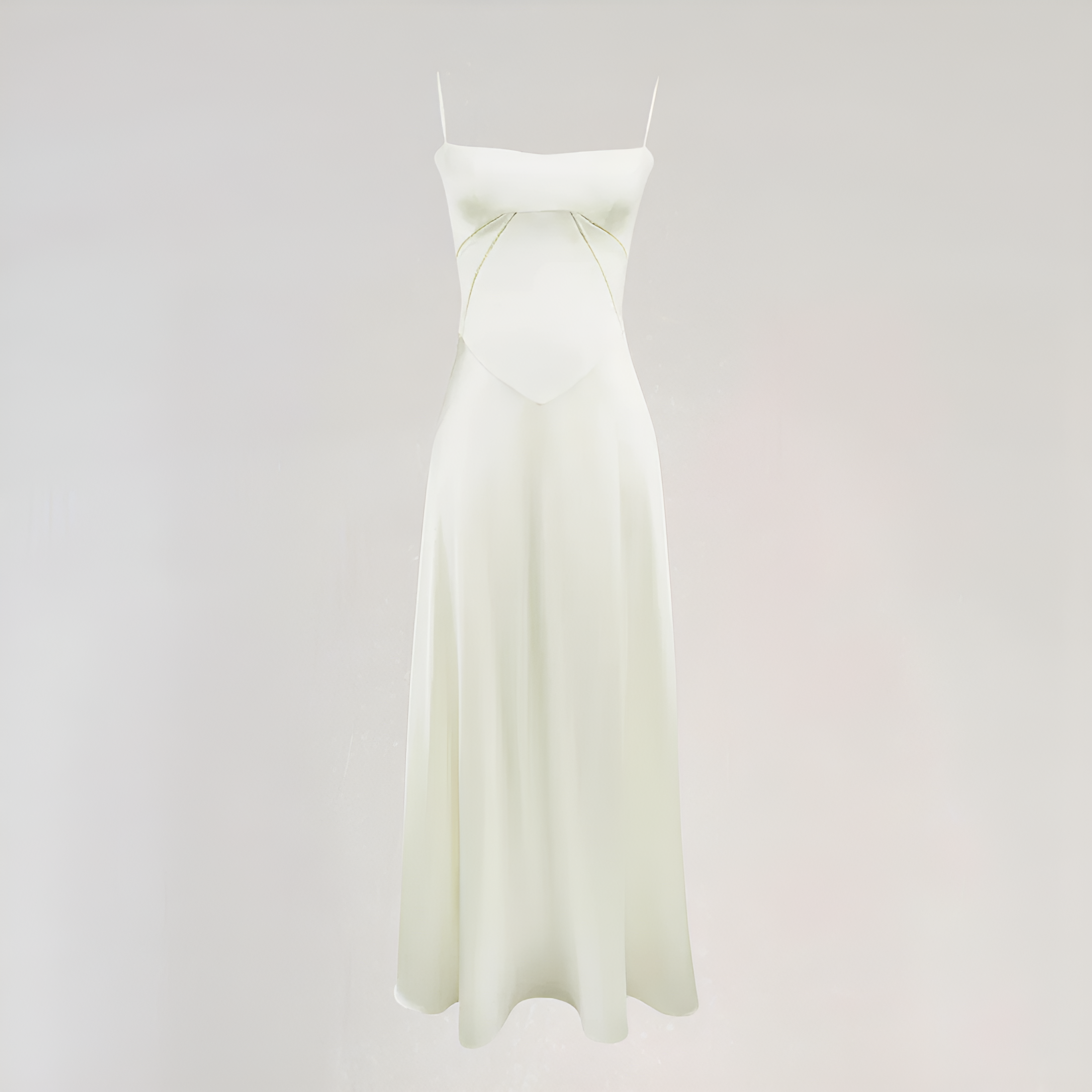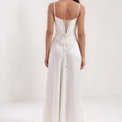 هذا الفستان الطويل يبرز القوام بفضل تصميمه على شكل كورسيه الذي يحدد الخصر بشكل رقيق. قصته السائلة تضيف حركة ورشاقة، بينما يضيف الظهر المصمم على شكل كورسيه لمسة رومانسية وهيكلية. مثالي للمناسبات، الحفلات أو الاحتفالات.