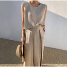 This set includes wide-leg pants and a round-neck top. Its loose fit ensures exceptional freedom of movement. Available in several elegant colors.