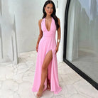 Tato dlouhá róba má hluboký výstřih a vysoký pas, který zvýrazňuje vaši siluetu. Odvážný rozparek a jemné vázání dodávají dotek sofistikovanosti. Ideální pro elegantní večery a speciální příležitosti.