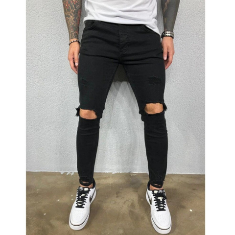 Diese zerrissene Hose bietet einen modernen und taillierten Schnitt. Erhältlich in Blau und Schwarz, passt sie sich leicht an alle Ihre Outfits an. Perfekt für einen lässigen und trendigen Look.