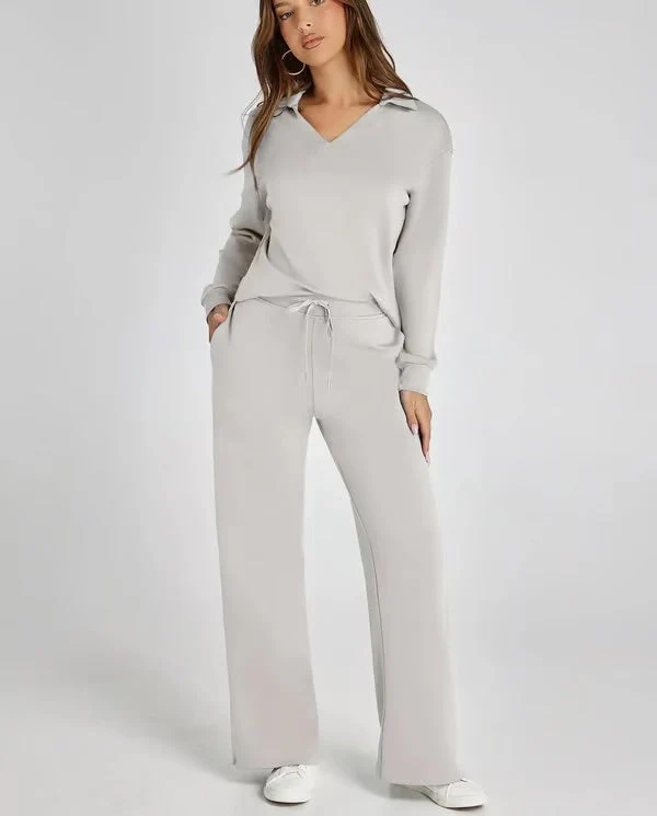 Αυτή η σύνθεση δύο κομματιών με γιακά συνδυάζει απαλότητα και κομψότητα. Ιδανική για χαλάρωση στο σπίτι ή για χαλαρές εξόδους. Διαθέσιμη σε πολλές αποχρώσεις για να προσαρμοστεί στο στυλ σας.