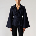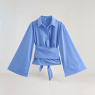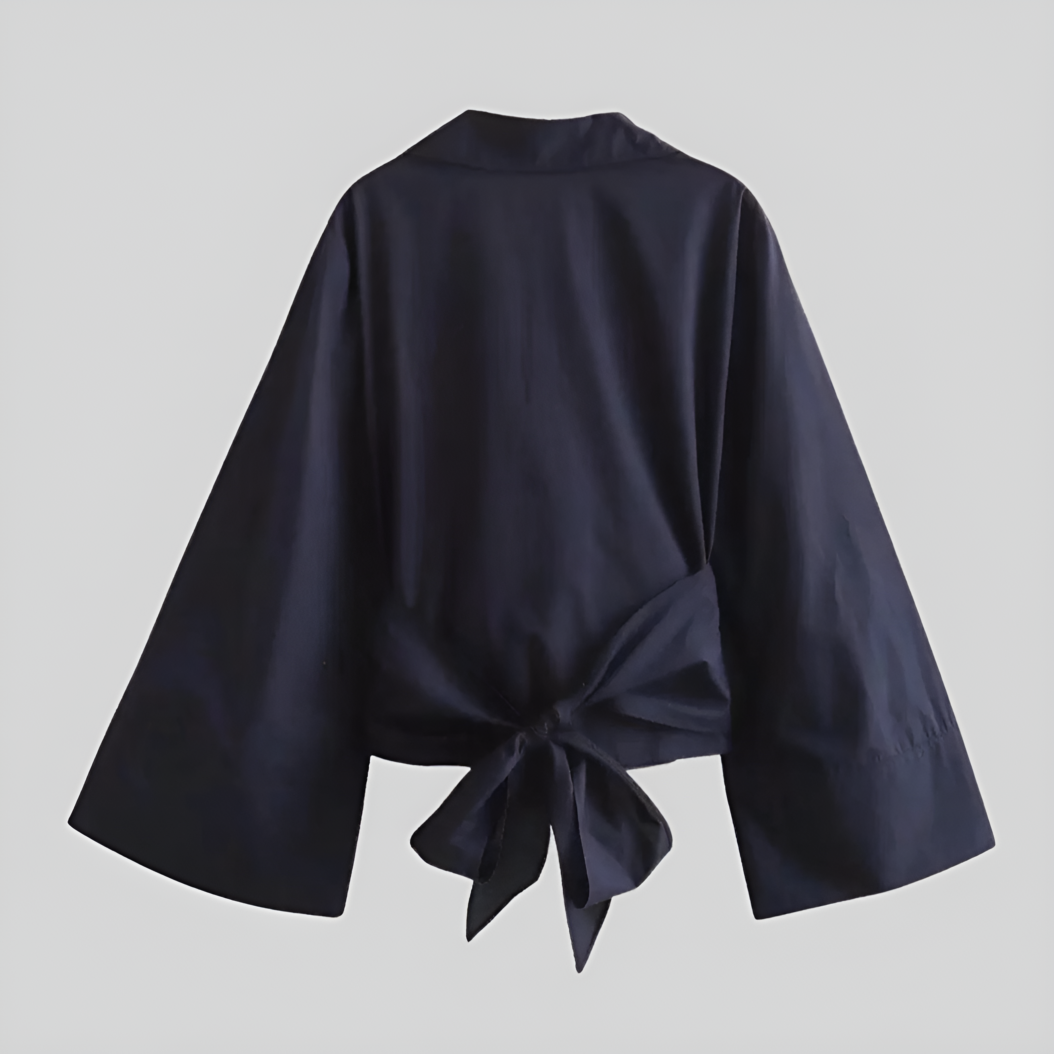 Tämä naisten kesähuppari tarjoaa imartelevan leikkauksen V-pääntiellä ja levenevillä hihoilla. Sen ristikkäinen kaksoisnapitus lisää ripauksen hienostuneisuutta. Täydellinen kuumille päiville, se yhdistää mukavuuden ja tyylin.