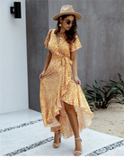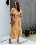 Tämä pitkä, tyylikäs mekko on täydellinen maalaishäihin tai ulkoilmajuhliin. Sen levenevä leikkaus, V-pääntie ja ohut vyö korostavat elegantisti siluettia. Kukka-aiheiset kuviot ja keltainen väri tuovat keväistä ja valoisaa tunnelmaa.