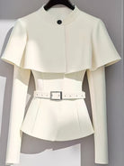 Tämä vyöllinen viittajakku korostaa siluettia tyylikkäällä ja modernilla ilmeellä. Sen rakenteellinen leikkaus ja säädettävä vyö korostavat vyötäröä elegantisti. Ihanteellinen viileille päiville, se tuo hienostuneisuutta kaikkiin asuihin.