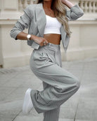 סט זה משלב בלייזר מובנה עם מכנסיים תואמים. הוא מציע סילואט אלגנטי ומקצועי. מושלם למשרד או לאירועים רשמיים.