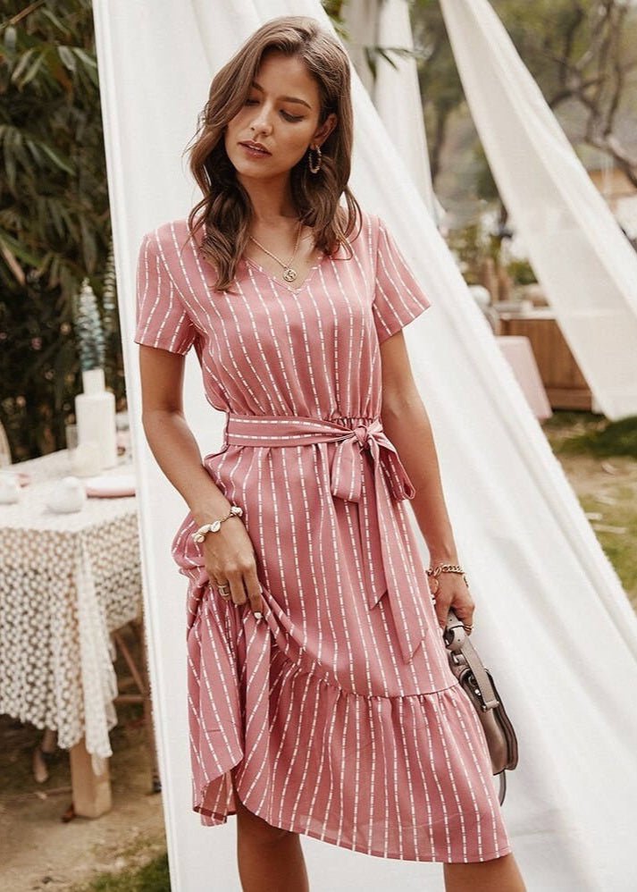 Ez a függőleges csíkos ruha folyékony szabásával és letisztult dizájnjával vonzza a figyelmet. V-alakú nyaka és rövid ujjai nőies érintést adnak. Ideális nyári napokra vagy egyszerű estékre.