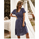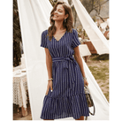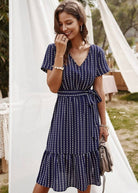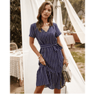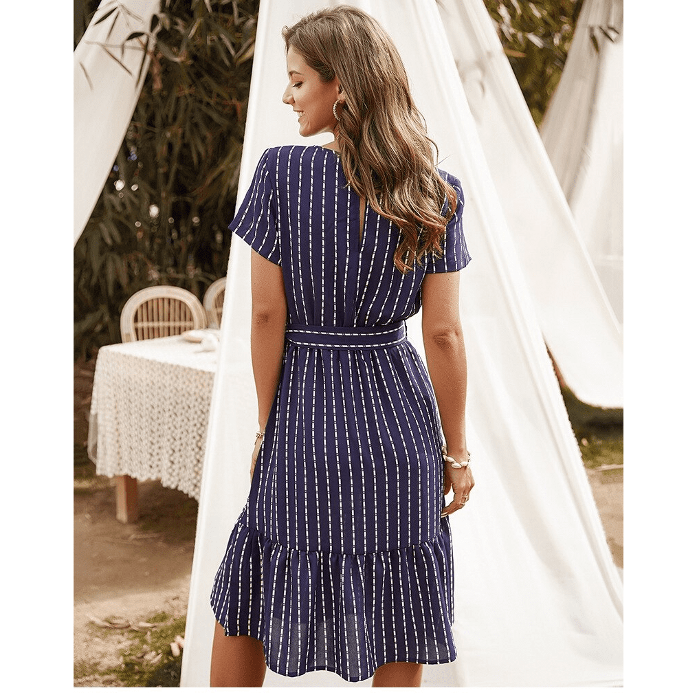 A tengerészkék színével, V-nyakával és megkötős övével ez a rövid ruha tökéletesen tükrözi a hippie chic szellemiségét. Aszimmetrikus szabása finoman modern érintést ad. Ideális egy romantikus estére vagy egy nyári kiruccanásra.