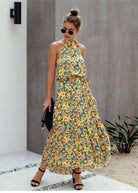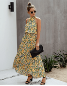 Questo vestito lungo bohemien affascina con la sua stampa floreale vivace e il suo elegante nodo da legare attorno al collo. La sua silhouette fluida valorizza delicatamente la figura offrendo al contempo un comfort ideale per le giornate calde. Perfetto per una fuga estiva o una passeggiata in città.