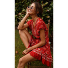 Questo abito rosso a taglio incrociato esalta la silhouette grazie al suo scollo a V e alla vita regolabile. La sua stampa floreale aggiunge un tocco bohémien, mentre le maniche a farfalla conferiscono leggerezza e femminilità. Perfetto per le giornate di sole o per occasioni estive.