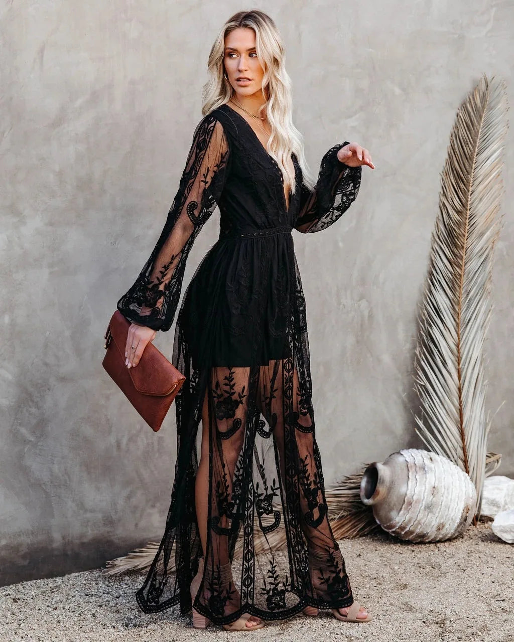 Véra | Długa Czarna Sukienka Haftowana Wydłużona I Nowoczesna
