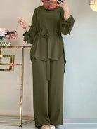 Versátil e refinado, este conjunto de duas peças combina conforto e estilo. Composto por uma túnica longa e uma calça fluida, é adequado tanto para saídas elegantes quanto para momentos do dia a dia.