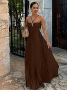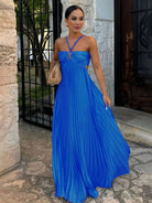 Este vestido longo sem mangas apresenta um design de corpete plissado com um decote halter e um costas cruzadas. Perfeito para dias quentes, combina conforto e estilo. A sua aparência descontraída faz dele uma escolha ideal para várias ocasiões de verão.