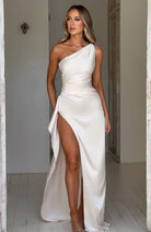 Este vestido de soirée de uma ombro seduz pela sua corte assimétrica elegante. O seu drapeado lisonjeiro e a fenda alta revelam subtilmente a perna para um visual glamouroso. Ideal para brilhar nas suas noites mais bonitas.