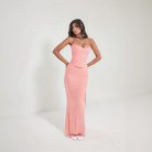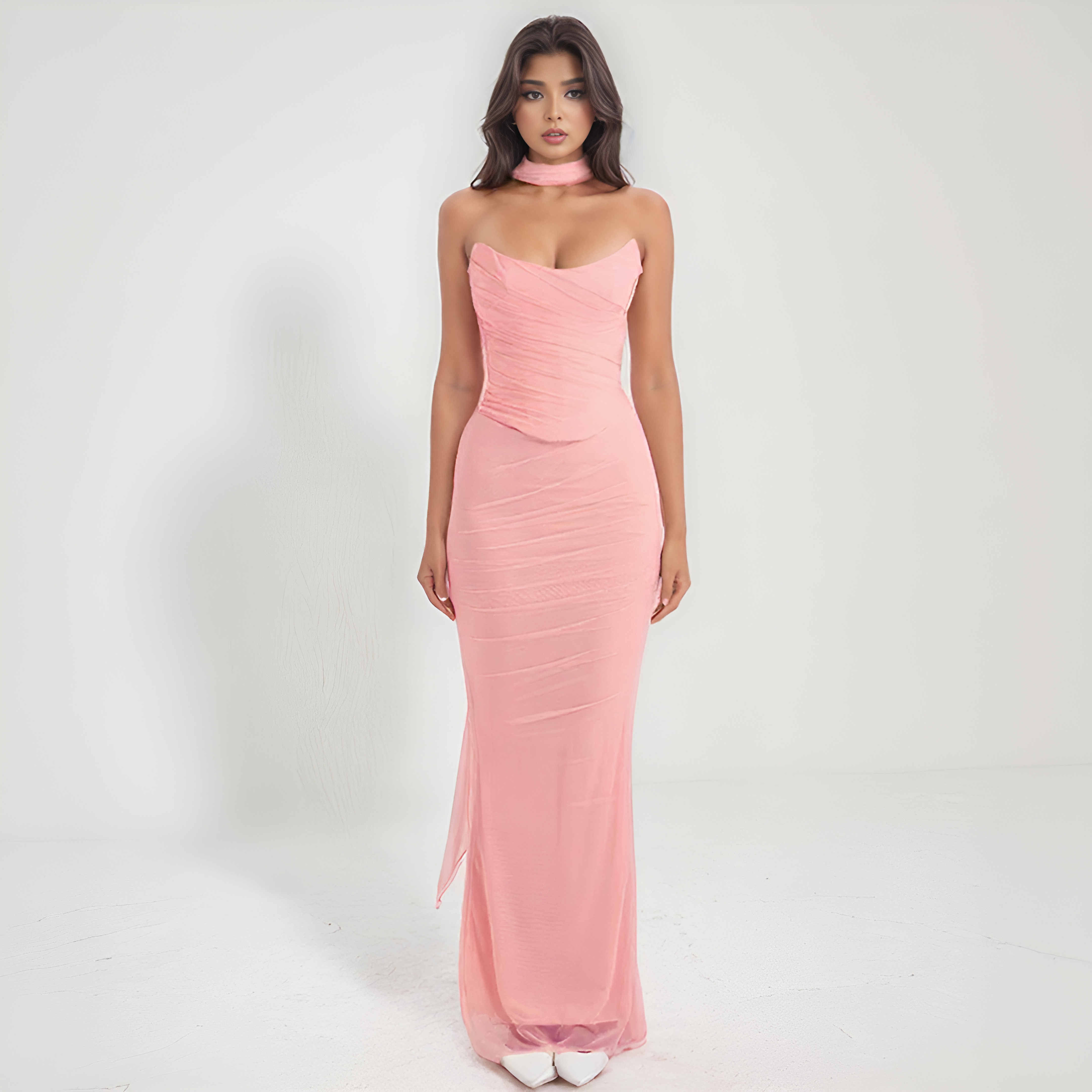 Este modelo de dois peças combina um top sem alças com um corte de corpete e uma saia longa ajustada para realçar a silhueta. Cada detalhe valoriza uma aparência elegante e contemporânea. Uma roupa perfeita para as suas ocasiões mais requintadas.