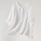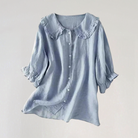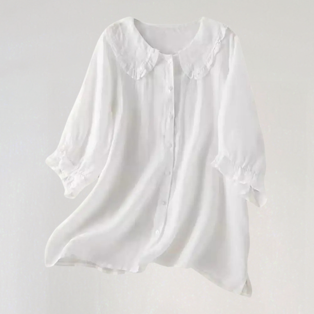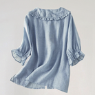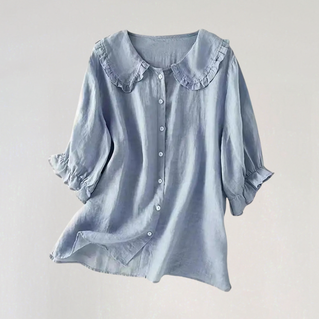 Esta camisa leve apresenta um colarinho com babados elegante e mangas três quartos para um estilo de verão descontraído. O seu corte amplo garante o conforto ideal ao longo do dia. Perfeita para diversas ocasiões, combina facilmente com diferentes partes de baixo.