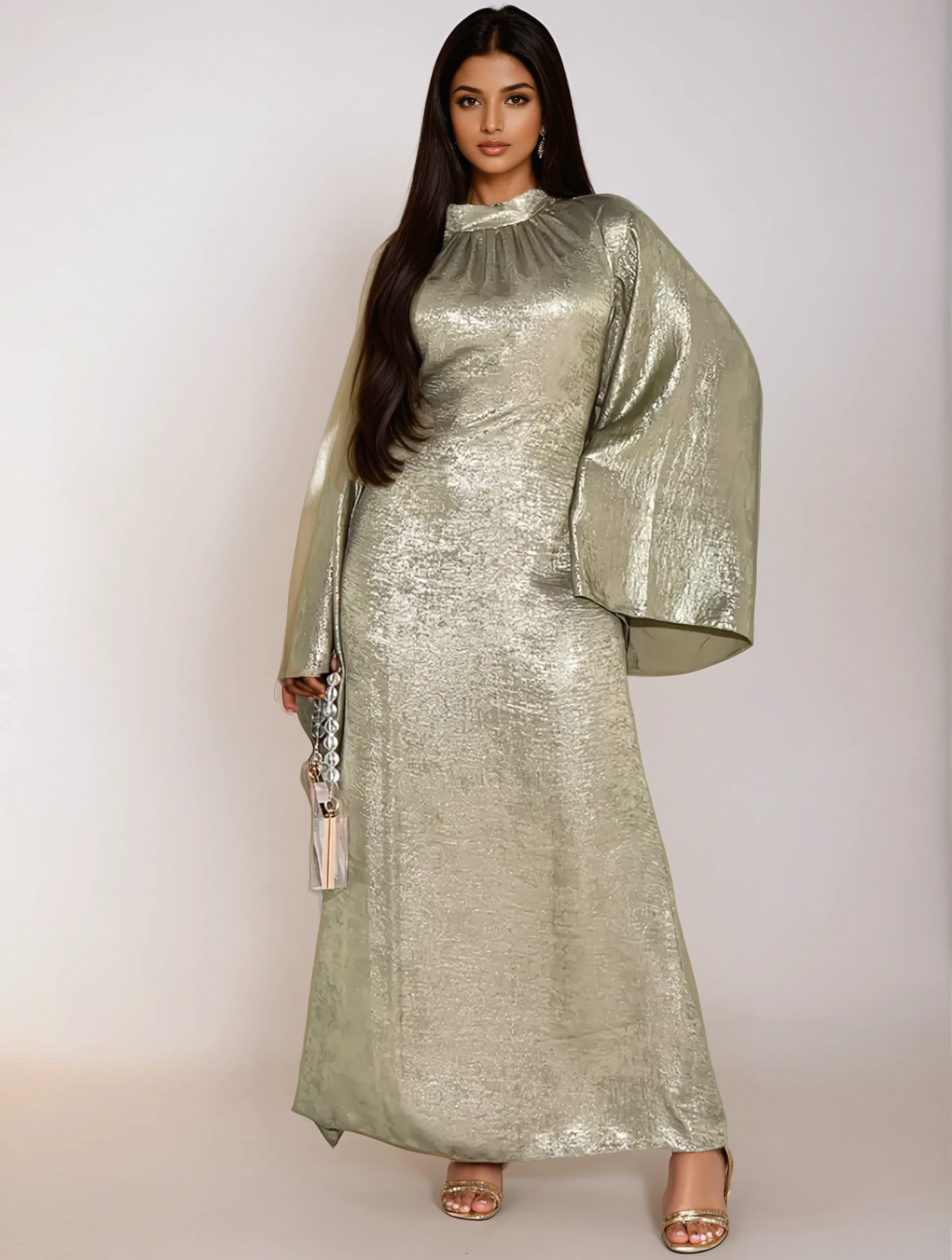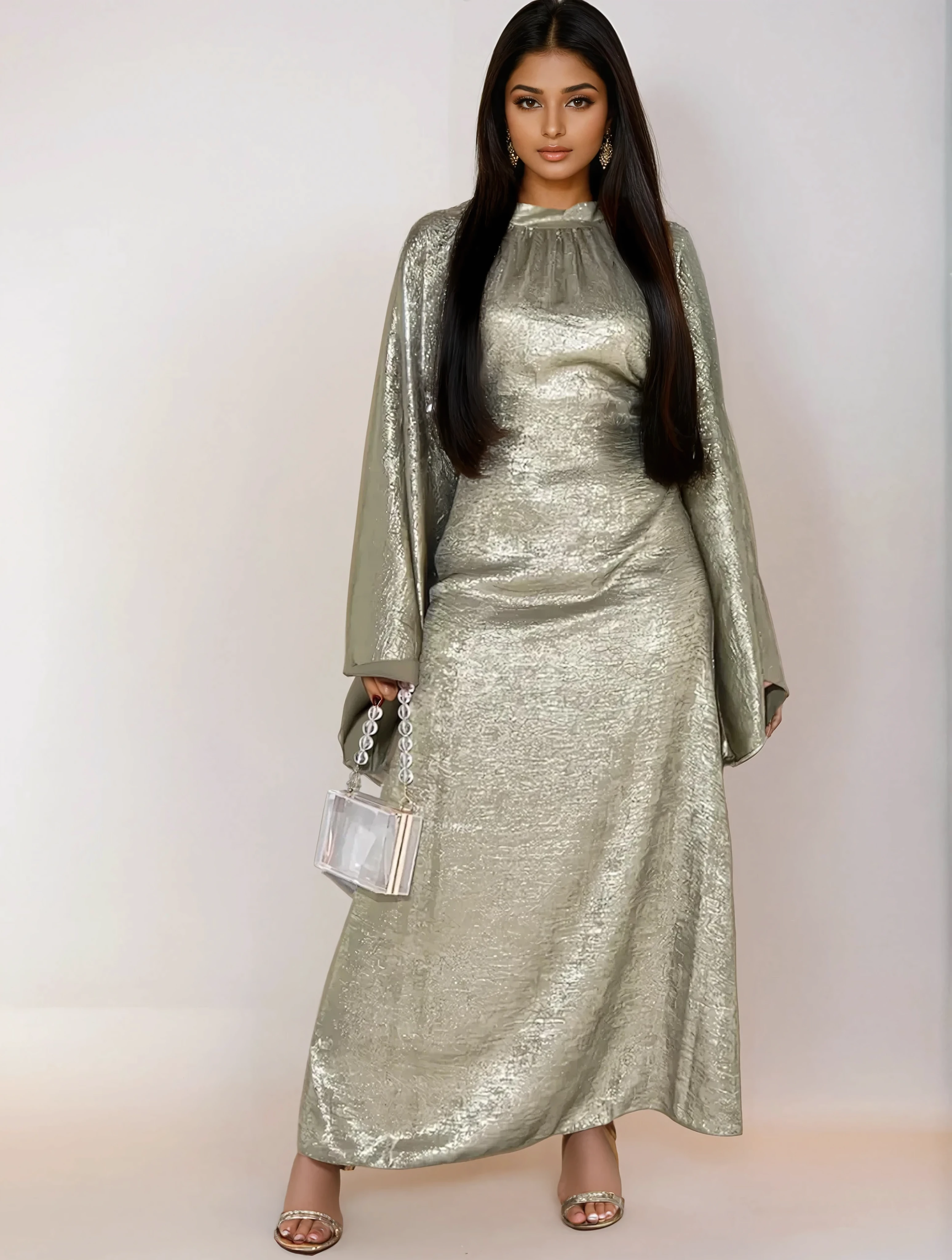Afișați o apariție grațioasă cu această rochie abaya verde deschis, fluidă și contemporană. Croiala sa lungă, țesătura opacă și culoarea sa blândă o fac o alegere ideală pentru evenimentele dumneavoastră speciale, recepții sau seri elegante.