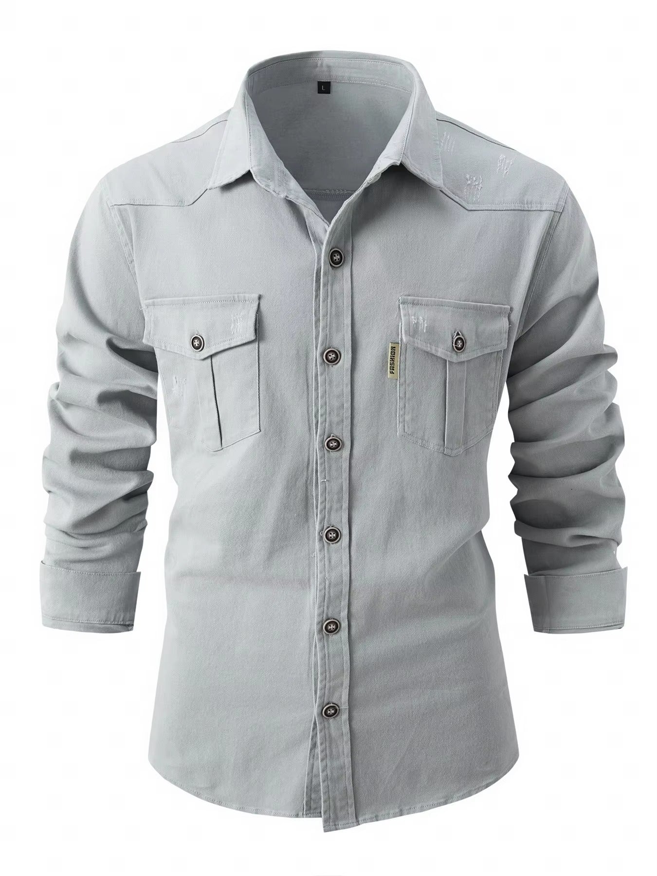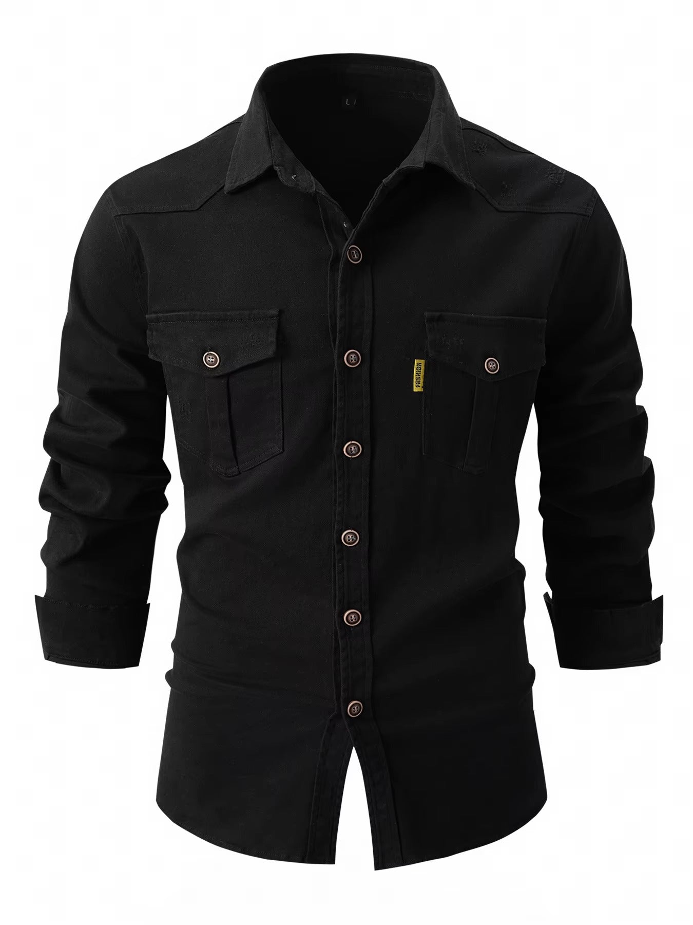 Această cămașă cu mâneci lungi este realizată din denim în nuanțe contrastante. Prezintă un guler clasic și o bandă de nasturi centrală, oferind un stil atât structurat, cât și lejer. Buzunarele cu clapetă pe piept adaugă o dimensiune funcțională. Croiala sa bine definită este potrivită pentru o varietate de ocazii, de la cele zilnice la ieșiri mai elegante.